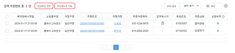 결제금액의 입금이 확인된 예약 주문 건을 선택하고, \[입금확인 처리] 버튼을 클릭하면 결제완료 상태로 변경됩니다.